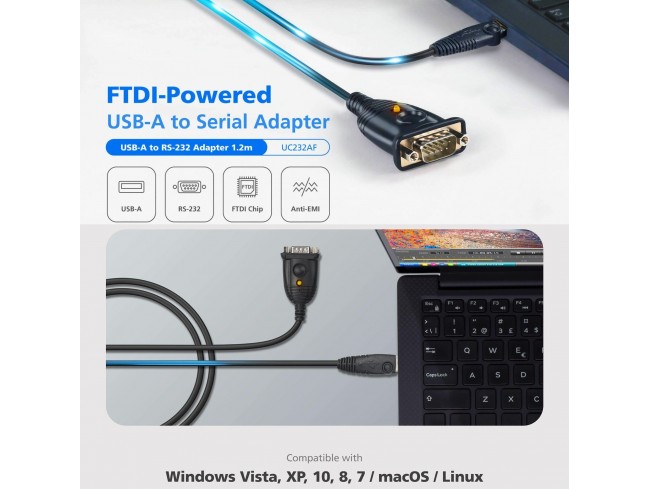 UC232AF ponuja povezljivost USB 2.0 in je opremljen z robustnim kablom, ki zagotavlja preizkušeno delovanje proti elektromagnetnim motnjam za zanesljiv prenos signala s hitrostmi do 921,6 Kbps.