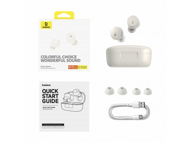 Paket vsebuje: 1x Baseus slušalke Bowie E18 bele bluetooth, 1x Polnilni kabel USB TipA-C, 2x Set nadomestnih čepkov, 1x Navodila