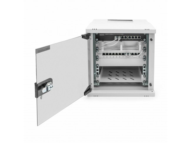 Digitus kabinet za zidno montažo sive barve je namenjen vgradnji 10" pasivnih in aktivnih komponent. Dimenzij: višina 6U 325 mm, širina 315 mm in globina 300 mm. Priloženi vijaki in matice za pritrditev opreme v kabinet. Na prednjih vratih, ki se odpirajo za 200 stopinj je nameščena tudi ključavnica. Kabinet je primeren za transport in je hitro sestavljiv.