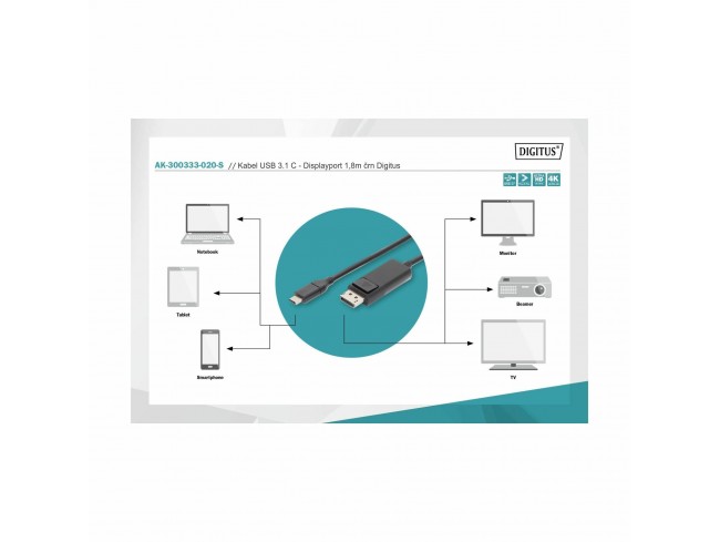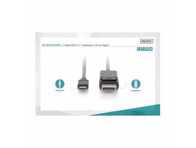 Digitus kabel omogoča priključitev DisplayPort monitorja na PC ali prenosnik z USB tip-C ali Thunderbolt™ 3 priključkom kot npr. MacBook ali Chromebook. Priključek mora podpirati DisplayPort Alternate Mode (DP Alt Mode), dolžine 1,8m.