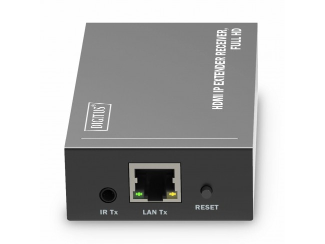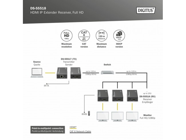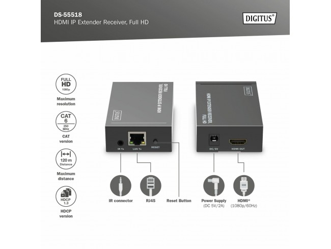 Digitus line extender DS-55518 sprejemna enota razširja signale Full HD z uporabo omrežnih kablov CAT6, CAT6A, CAT7, CAT8 do 120m. Dodatni integrirani IR (enosmeren) vmesnik omogoča daljinsko upravljanje vhodnega vira z izhodnega zaslona (na strani sprejemnika. Z uporabo omrežnih stikal in oddajnih enot (DS-55517) lahko vaše video vsebine delite na do 253 zaslonov prek že obstoječega omrežja (IP povezava) in jih razširite na neomejeno razdaljo.