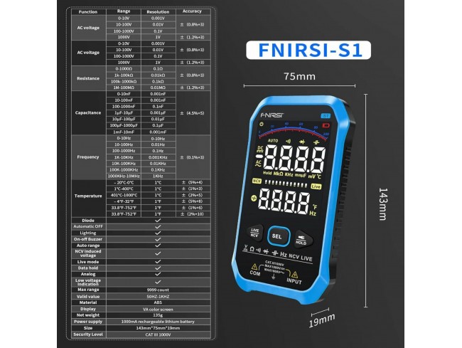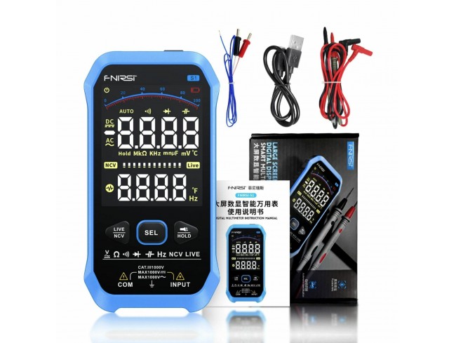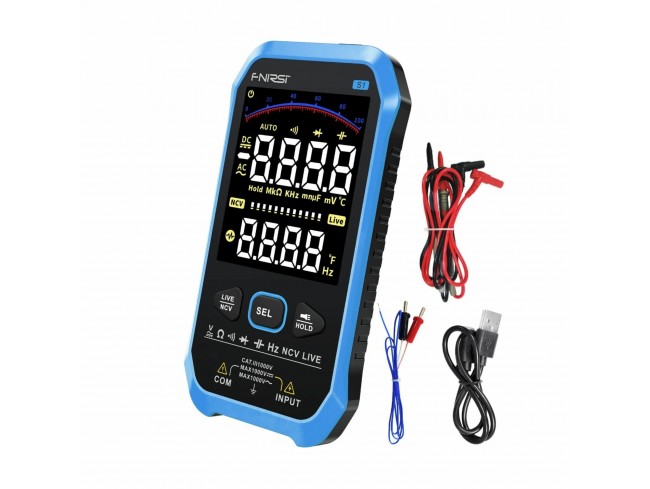 Fnirsi S1 je pametni digitalni multimeter za merjenje AC in DC napetosti z avtomatsko identifikacijo meritev, True RMS zaznavanjem in NCV funkcijo. Ima zaščito proti preobremenitvi, funkcijo zadržanja podatkov, vgrajeno svetilko in polnilno baterijo.