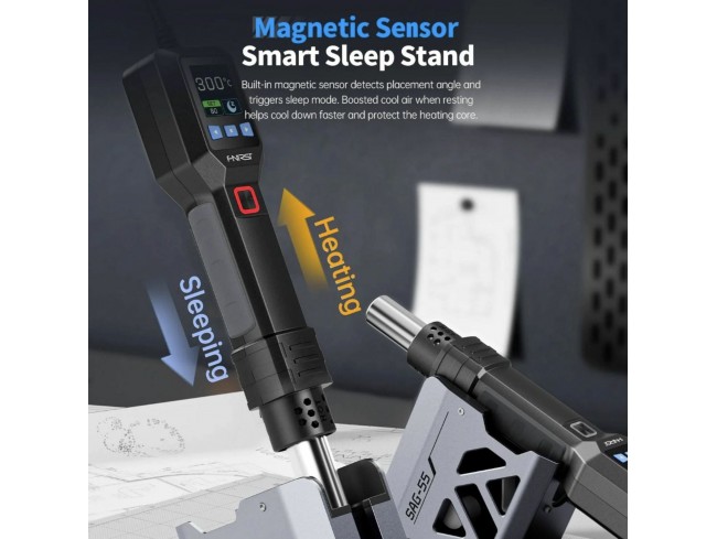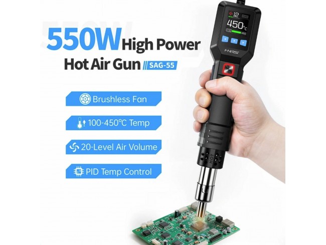 FNIRSI SAG-55 Plus je pametna pištola na vroč zrak z močjo 550 W, PID nadzorom temperature od 100 do 450 C. Ima 1.54 palčni LCD zaslon, magnetni senzor mirovanja na stojalu, brez krtačni ventilator in podporo za vroč in hladen zrak.