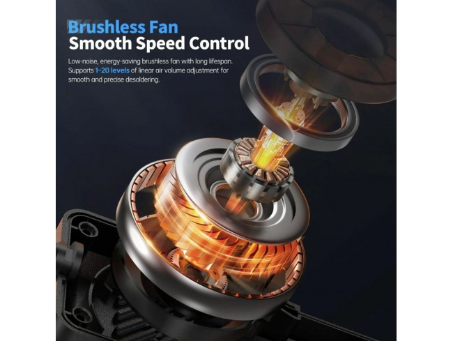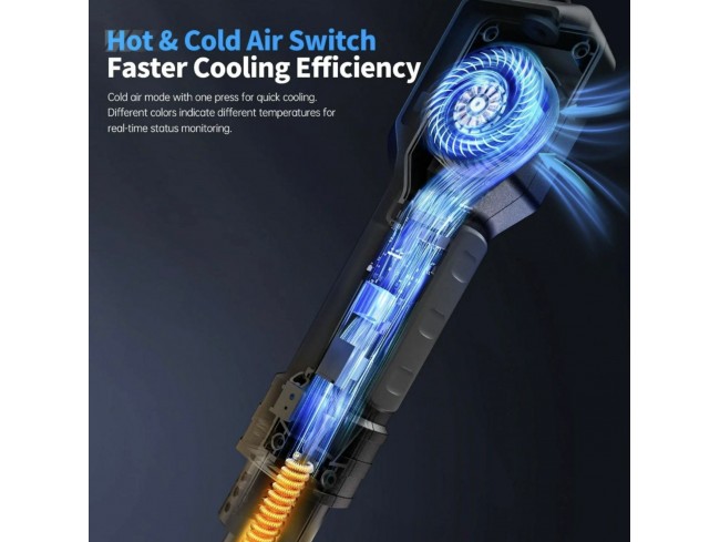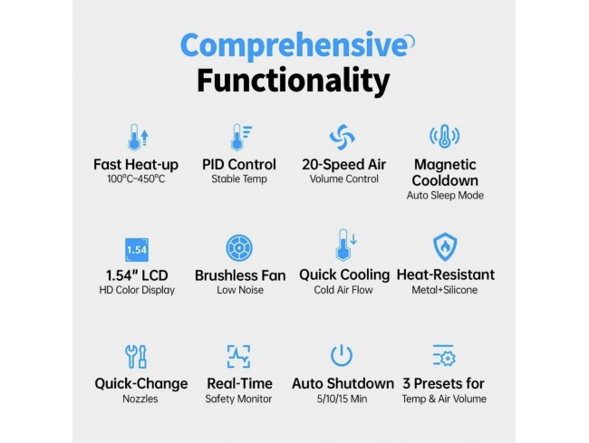 FNIRSI SAG-55 Plus je prenosna pametna pištola na vroč zrak, namenjena spajkanju, razspajkanju in servisiranju elektronskih komponent. Uporablja mikrokrmilnik s PID natančnim nadzorom temperature, ki omogoča hitro segrevanje z zmanjšanim toplotnim stresom in daljšo življenjsko dobo grelnega elementa. Temperaturni razpon znaša od 100 do 450 C.