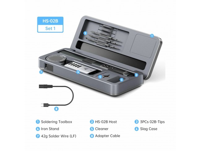 Paket vsebuje: 1x HS-02B spajkalnik, 3x HS-02B konica, 1x DC na TipC adapter za napajalni kabel, 1x Mini stojalo za spajkanje 1x Ohišje za shrambo, 1x Cin za spajkanje, 1x Set konic, 1x Navodila