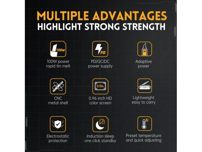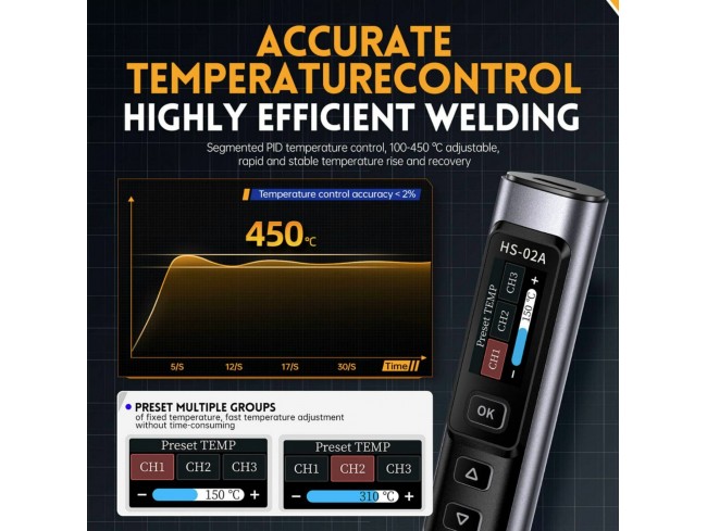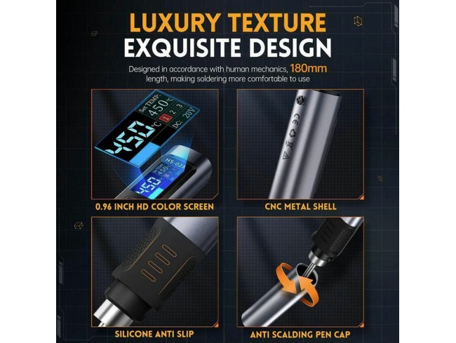 Temperaturno območje 100–450 °C omogoča hitro segrevanje in stabilno delovanje. Opremljen je z IPS barvnim zaslonom za nadzor parametrov. Ohišje iz CNC aluminijeve zlitine z ergonomičnim silikonskim delom nudi zanesljiv oprijem, konice serije HS-02B-K pa so zamenljive. Primeren je za servis elektronike, montažo naprav in natančna hobi opravila.
