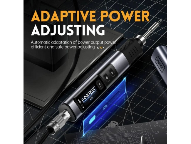 Prenosni spajkalnik Fnirsi HS-02B s TipC napajanjem do 100 W, temperaturnim razponom 100–450 °C in 0.96 cm IPS zaslonom. Ohišje iz aluminijeve zlitine, hitro segrevanje ter podpora PD in QC, pakirano v priročni torbi v setu s tremi konicami.