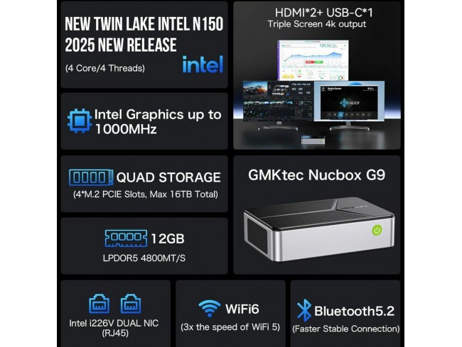 GMKtec Nucbox G9 mini PC za NAS z Intel N150 procesorjem in 12 GB DDR5, 512 GB NVMe SSD, 4x M.2 NVMe režami za do 16 TB, dual 2.5 GbE LAN priklopom, WiFi 6 in Bluetooth 5.2. Omogoča dual boot Windows 11 Pro in Ubuntu OS in priklop do 3x zaslonov v 4K.