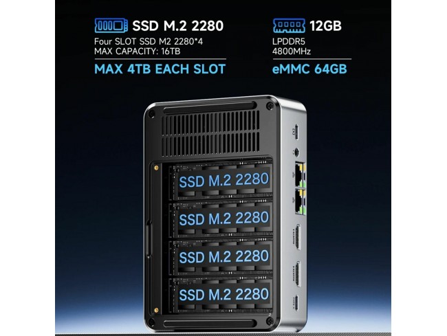 Računalnik vključuje 12 GB DDR5 pomnilnika ter 512 GB NVMe SSD. S štirimi M.2 NVMe režami omogoča razširitev shrambe do 16 TB, kar je še posebej primerno za NAS sisteme.
