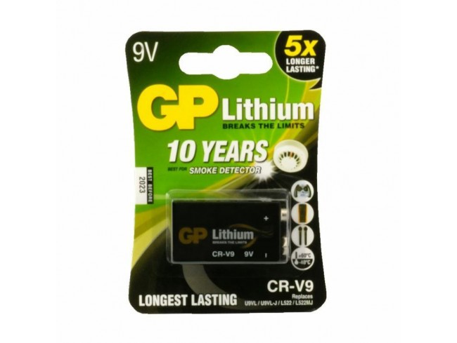 Nova 9V baterija GP CR-V9 (litijeva,nepolnilna) je idealna izbira za dimne alarme in ostale naprave, katerim želite zagotoviti zanesljiv vir energije kar najdlje časa in se tako izogniti nepotrebni večkratni menjavi . 5 X več energije kot katerakoli običajan 9V baterija.