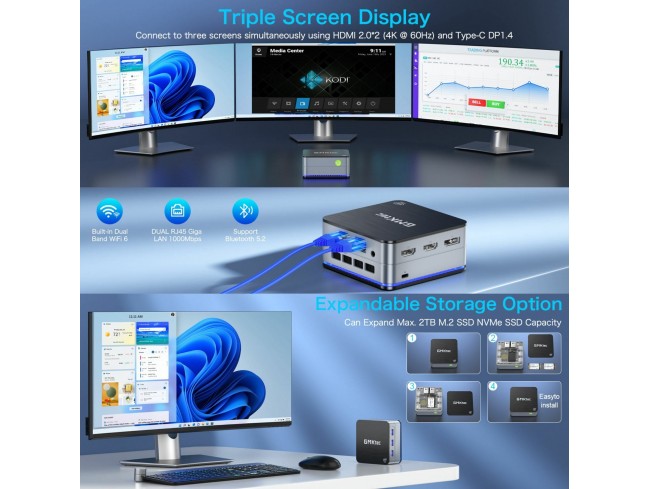 GMKtec G2 ponuja različne možnosti brezžične povezave, vključno z Wi-Fi 6 Dual Band, Bluetooth 5.2. Poleg tega razpoložljiva dvojna vrata LAN RJ45 1000M zagotavljajo hitrosti 1000 Mbps. Možnost priklopa do treh monitorjev zahvaljujoč priključkom HDMI 2.0 in DisplayPort. Računalnik podpira Wake On LAN, PXE Boot, RTC Wake in Auto Power On, zaradi česar je idealen za uporabo v strežniku.
