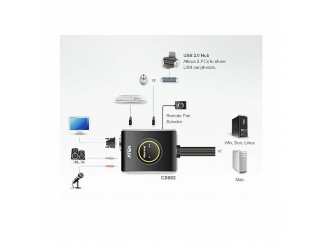 Aten KVM stikalo CS682 avtomatski USB preklopnik, ena konzola za nadzor dveh računalnikov, možnost preklapljanja s tipkovnico, miško ali uporabo priloženega žičnega daljinca.