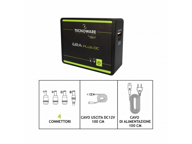 Paket vsebuje: 1x Tecnoware UPS ERA PLUS 9-12V PoE 24-48V 25W za DC naprave FGCERAPLDC252, 1x AC vhodni kabel - 100 cm dolžine - USB TipC do 5,5 x 2,5 mm konektor - 12V, 3x konektorji (3,5 x 1,35 mm - 4,8 x 1,7 mm - 5,5 x 2,1 mm)