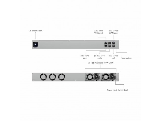 Ubiquiti EFG agotavlja do 12.5 Gbps usmerjanja z aktivnimi varnostnimi funkcijami ter omogoča visoko razpoložljivost prek VRRP (Shadow Mode) z uporabo dveh naprav. Opremljena je z več hitrostnimi omrežnimi vmesniki, ki vključujejo 25G, 10G in 2.5 GbE povezave, ter omogoča prilagodljivo konfiguracijo LAN in WAN portov. Dvojna hot-swap napajalnika zagotavljata redundanco in neprekinjeno delovanje.