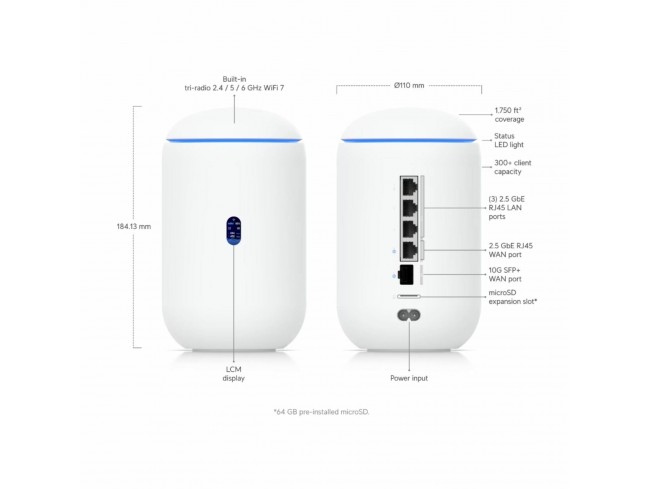 Ubiquiti WiFi7 UDR7 je zmogljiv namizni usmerjevalnik, zasnovan za sodobna omrežja. Ponuja podporo za standard WiFi 7, kar zagotavlja izjemno hitro in stabilno brezžično povezljivost. Opremljen je z 10G SFP+ povezljivostjo, vgrajenim PoE priklopom za napajanje omrežne naprave, režo za microSD shranjevanje ter popolno podporo UniFi aplikacijam.