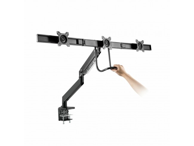 White Shark RHAMSES III je namizni nosilec s plinsko vzmetjo, na katerega lahko namestite tri monitorje. Vsak monitor je mogoče vrteti neodvisno. Z USB in multimedijskimi priključki lahko vsak zaslon še vedno uporabljate za prenos podatkov, polnjenje itd.